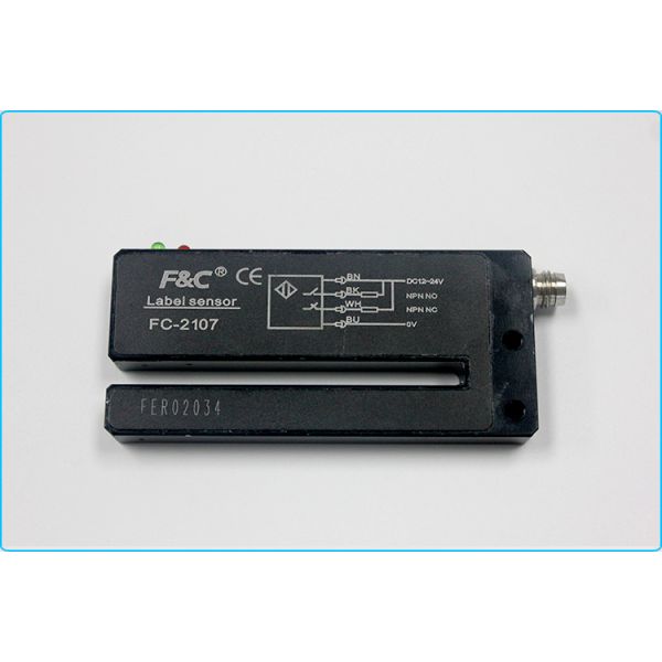 Optical Label sensor used for most common sticker label and not suitable for clear label sensing, it is very popular in market with competitive price. Model FC-2107/D, it is NPN output with M8 4 pin connector and potentionmeter, easy to adjust, install and change.